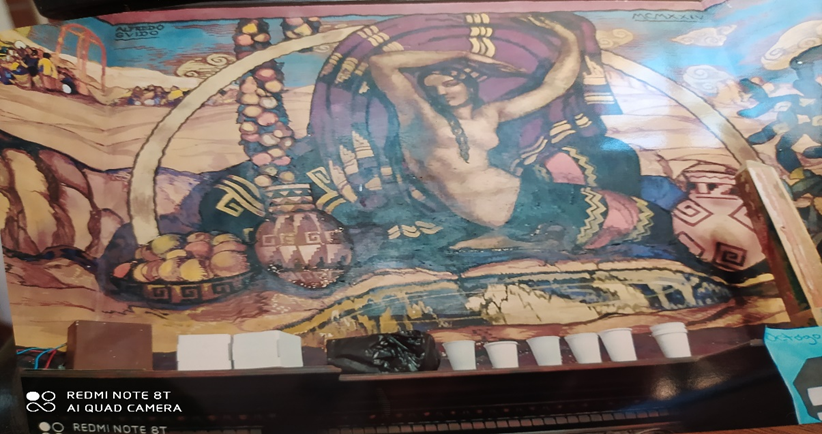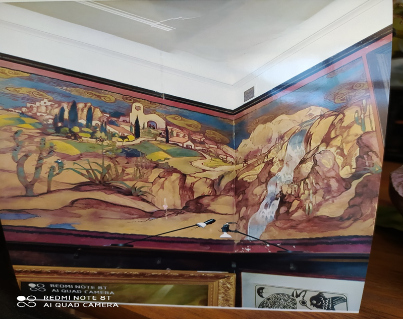 La Loma fue en los años veinte una suerte de nudo cultural en las sierras cordobesas. Y fue allí donde Alfredo Guido ofreció una ponderación del mundo andino. El mural pintado por él en la sala de la casona es magnífico. Es “la joyita” mejor guardada de las sierras. La siguiente descripción corresponde al catálogo de la exposición “La Hora Americana”, realizada en el Museo Nacional de Bellas Artes de Buenos Aires, que exploró el indigenismo, nacionalismo y americanismo en el arte y arquitectura argentino entre 1910 y 1950, curada por Roberto Amigo y Alberto Petrina. Analiza la identidad cultural y el imaginario andino. Explora el “americanismo” como corriente ideológica y estética en el arte argentino, influenciada por la idea de “Eurindia” de Ricardo Rojas. Se buscó resaltar la identidad americana y la tradición indígena frente a narrativas históricas que la excluían.